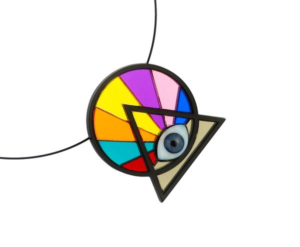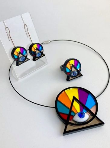 Juego de acrílico espejo de colores con ojo de vidrio. Contorno negro.