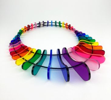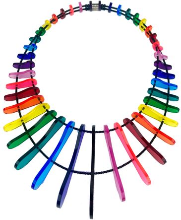 Collar de acrílico traslúcido con cuentas de vidrio y broche de imán.