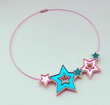 Dije de resina y gargantilla de acero inoxidable plastificado. La gargantilla puede ser negra o roja. Argolla de plata 925.
